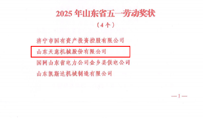 喜報(bào)丨熱烈慶祝天意機(jī)械榮獲“山東省五一勞動(dòng)獎(jiǎng)狀”
