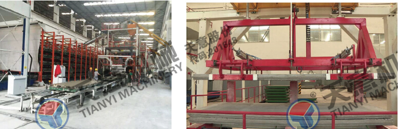 多功能墻板生產線,可生產“三明治”夾芯板,鋼邊框屋面板、樓面板,不帶面板復合板。生產線主要分為自動配料系統(tǒng)、攪拌系統(tǒng)、發(fā)泡系統(tǒng)、中央控制配電系統(tǒng)、輕質混凝土布料系統(tǒng)、磨光系統(tǒng)、模具循環(huán)系統(tǒng)、養(yǎng)護系統(tǒng)、碼垛系統(tǒng)等部分組成。