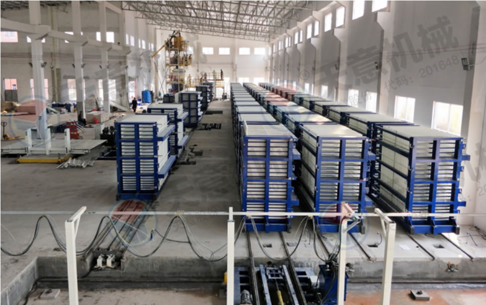 該復(fù)合墻板生產(chǎn)線采用立式旋轉(zhuǎn)臥式出板復(fù)合墻板成型機,一次可生產(chǎn)四十塊墻板,該生產(chǎn)線主要分為:配料攪拌系統(tǒng)、墻板成型系統(tǒng)、液壓整體開模系統(tǒng)、液壓翻轉(zhuǎn)系統(tǒng)、整體出板翻轉(zhuǎn)碼垛系統(tǒng)、成型機自動循環(huán)系統(tǒng)、變頻擺渡系統(tǒng)、數(shù)控配電系統(tǒng)等部件 組成。該生產(chǎn)線自動化程度高,液壓開合模,解決了傳統(tǒng)立式復(fù)合墻板機人工開合安全隱患,提高了工作效率。設(shè)備配有整體出板碼垛系統(tǒng),解決了傳統(tǒng)人工出板方式,減少產(chǎn)品的破損率,提高了產(chǎn)能。生產(chǎn)線使用密封式泵送系統(tǒng)配備雙工位注漿槍,注漿速度快密實度高,材料粘結(jié)更緊密。
