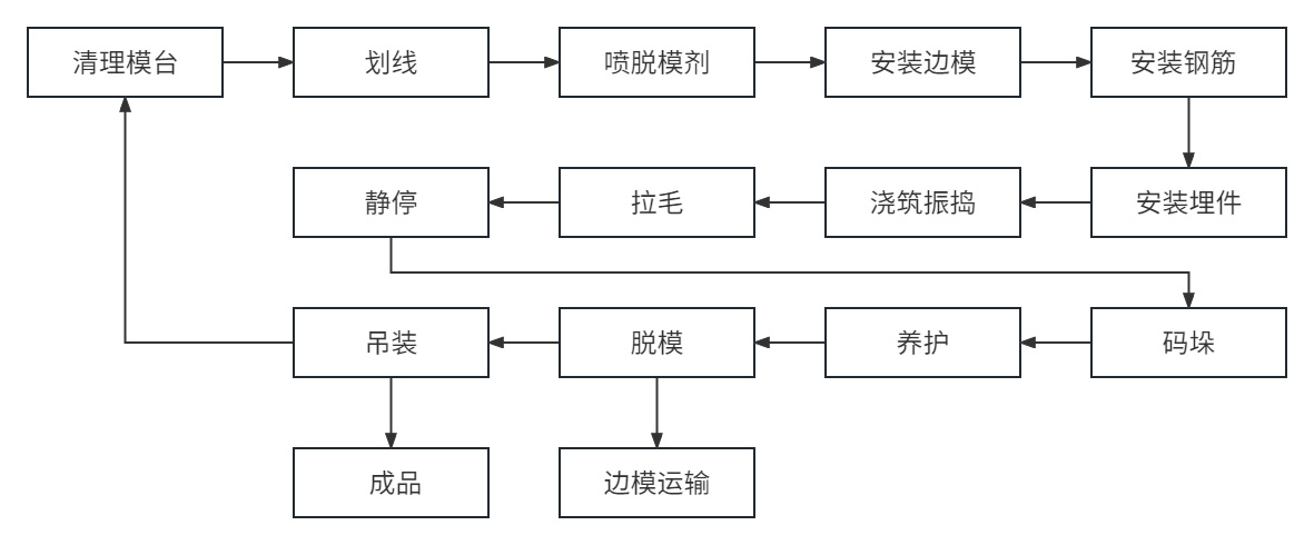 PC環(huán)形疊合板生產(chǎn)工藝主要由清理模臺(tái)、噴脫模劑、劃線、安裝邊模、安裝鋼筋、安裝埋件、澆筑振搗、拉毛、靜停、碼垛、養(yǎng)護(hù)、脫模、吊裝等工藝組成。