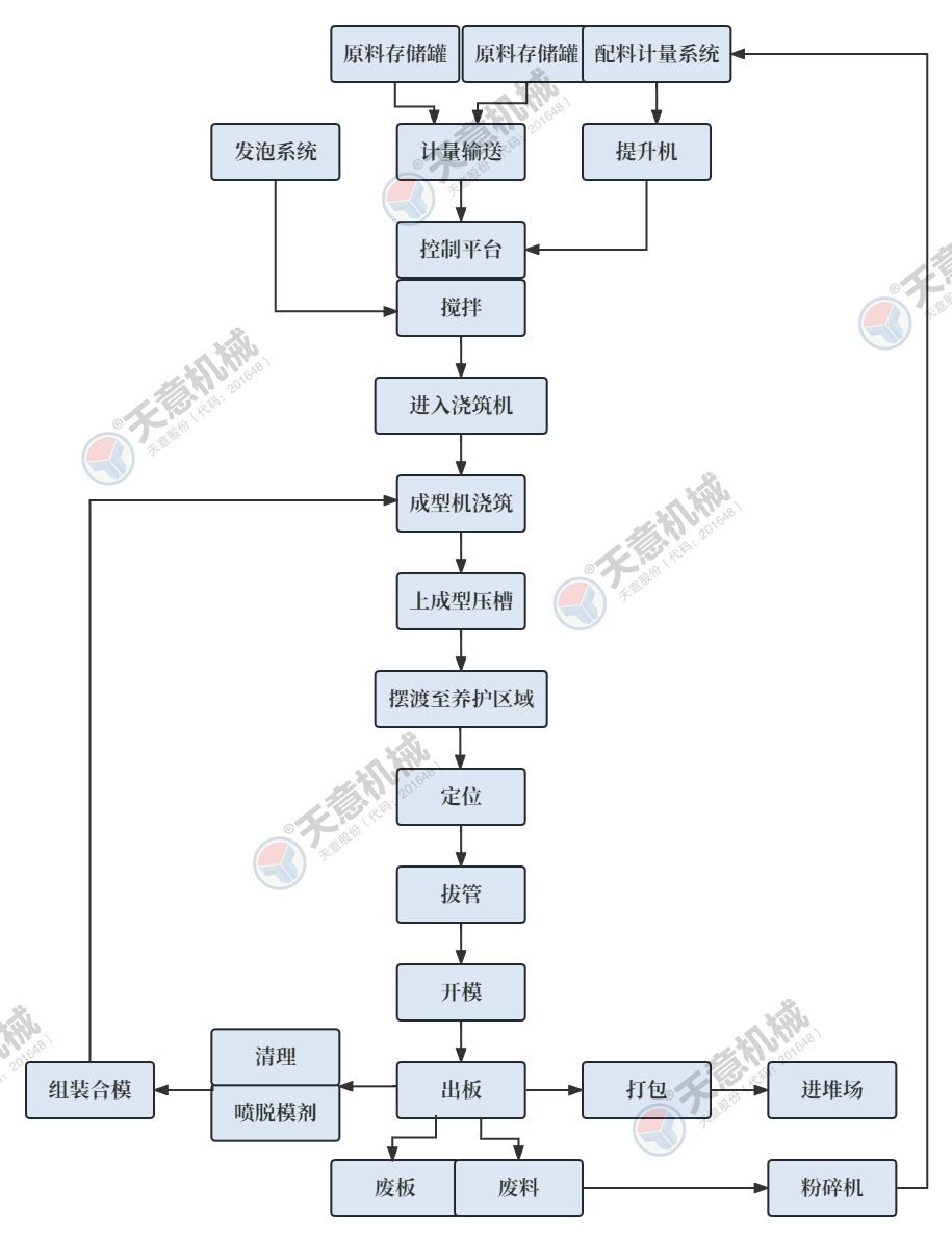TY20型輕質(zhì)墻板生產(chǎn)線包括:墻板成型機(jī)、整體穿抽管系統(tǒng)、發(fā)泡系統(tǒng)、水箱、電子計(jì)量儲(chǔ)料倉、螺旋上料輸送機(jī)、儲(chǔ)料罐、螺旋輸送機(jī)、EPS熟化料倉、硫化干燥床、EPS預(yù)發(fā)機(jī)、數(shù)控配電室、發(fā)泡攪拌機(jī)、整體出板系統(tǒng)、叉車、成品堆放區(qū)、擺渡車。